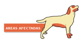 - Lesiones cutáneas bien delimitadas (zonas enrojecidas sin pelo)